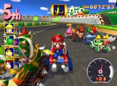 | Revelado pela primeira vez na E3 2001, o "Mario Kart" para GameCube foi mostrado apenas com um breve vídeo de Mario e Luigi andando nos tradicionais carros das versões anteriores. Agora, dois anos depois, o jogo volta à superfície - totalmente remodelado. Como prometido pelo criador Shigeru Miyamoto, "Double Dash" traz grandes mudanças à antiga fórmula da série. A maior mudança está nos carros - ao invés dos tradicionais karts, agora diferentes veículos oferecem dois assentos: um para o motorista e outro para um atirador. Enquanto um personagens dirige o carro, o outro pode mirar e atacar os oponentes com os mais diferentes itens. As implicações dessa mudança são grandes: cada personagem tem habilidades diferentes no volante e acesso a oito itens exclusivos (além dos seis convencionais). Os dois personagens podem ser trocados a qualquer momento - e é possível montar qualquer combinação de personagens. Entre os participantes confirmados estão Mario, Luigi, Bowser, Princesa Peach, Daisy, Wario, Waluigi, Donkey Kong, Diddy Kong, Baby Mario, Baby Luigi, Bowser Jr., Yoshi, Birdo, Koopa e ParaKoopa. Além de poder dividir um mesmo carro, jogadores terão a opção de juntar oito pessoas em uma mesma partida ligando GameCubes em rede local. | |